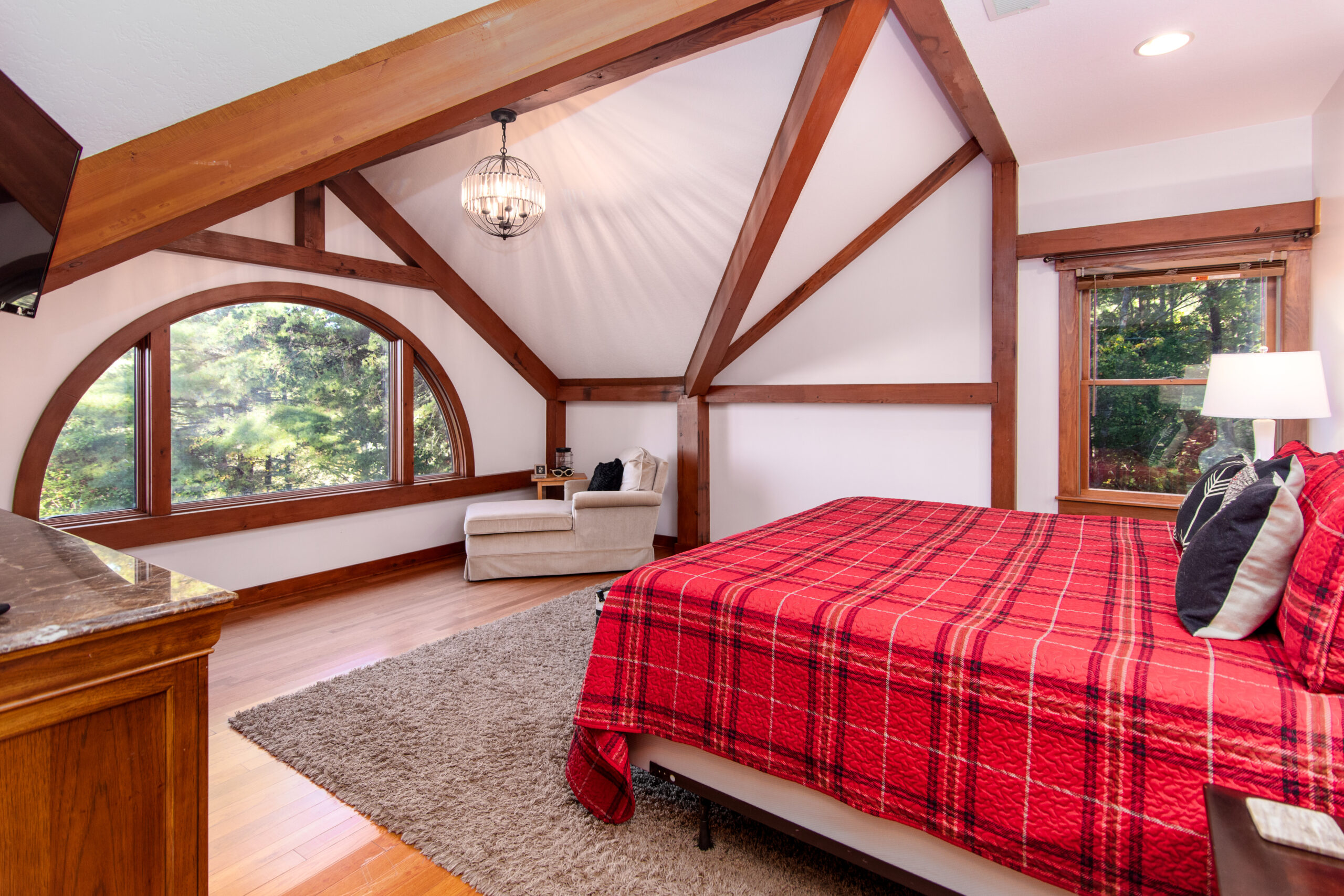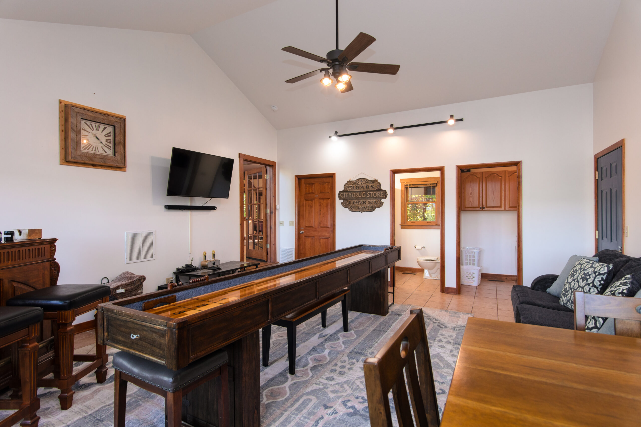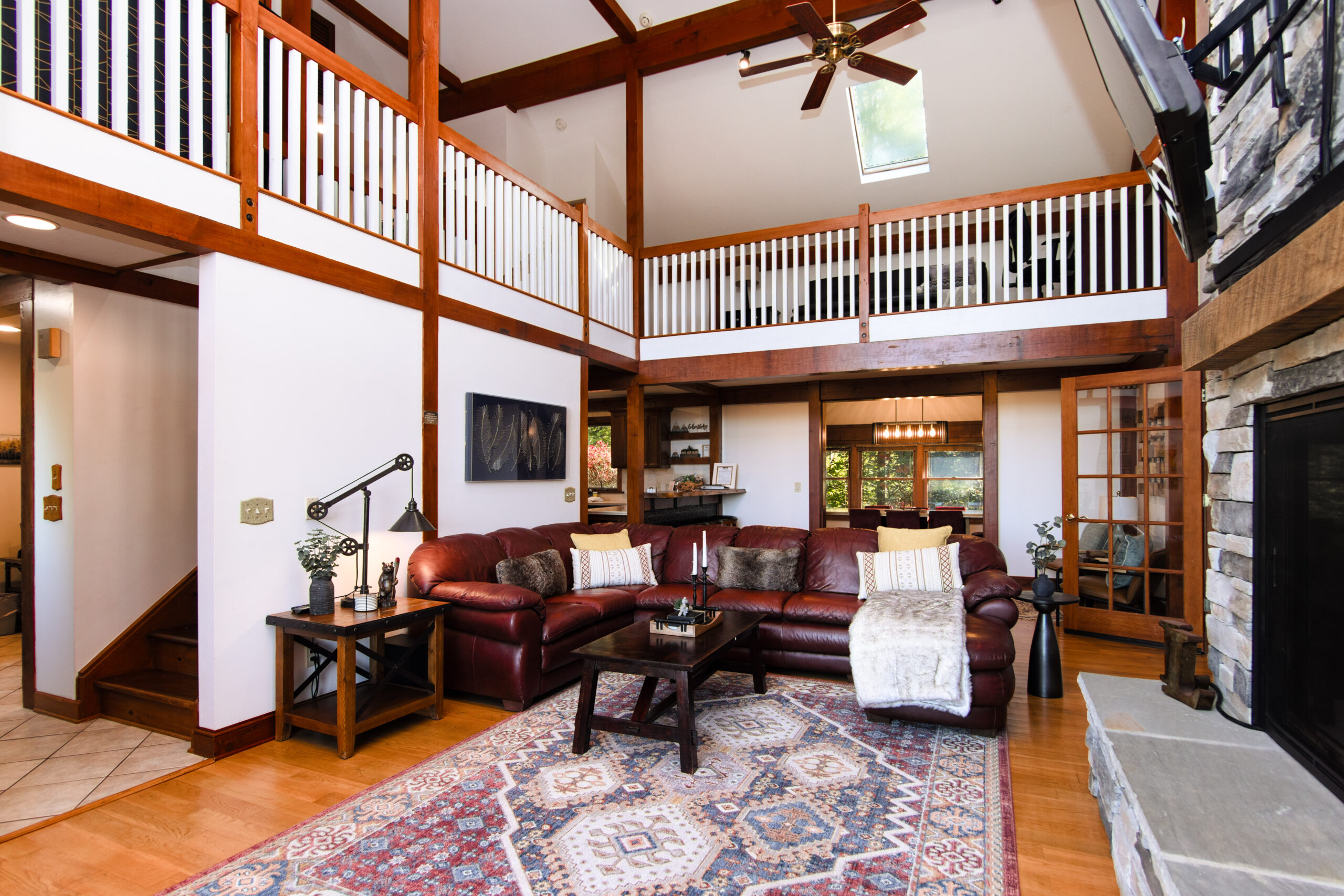 Cabin Interior Downstairs entrance Kitchen Living Room Fireplace View from Living Room Screened in Porch Downstairs Master King Bedroom Master bedroom Master bath Upstairs Loft Upstairs King bedroom Upstairs King bedroom Upstairs Queen bedroom with skylight Loft twin pullout bed Upstairs bathroom w/shower Upstairs bathroom dual vanities Upstairs loft area Office with a sleeper sofa Gameroom View from Upstairs